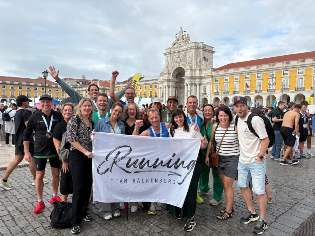 En dat klopt. Na kilometer 41 nader je het centrum van Lissabon, waar ze voor de grap zeven finishbogen hebben geplaatst. Zeven keer denk je dat je er bent. Na de zesde boog staan onze partners en vrienden te juichen, en onder een prachtig regeringsgebouw loop je over de blauwe loper het indrukwekkende Praça do Comércio op. Ongelofelijk: je bent écht gefinisht.